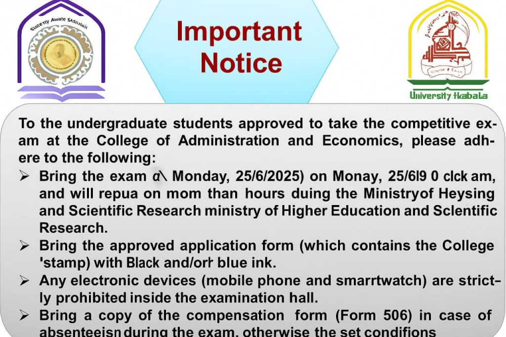 The College of Administration and Economics at the University of Karbala announces the following instructions for students eligible to take the competitive examination for the current academic year. The exam is scheduled to be held on Monday, June 30, 2025, at 9:00 AM, and will last for three hours, in accordance with the directives of the Ministry of Higher Education and Scientific Research.