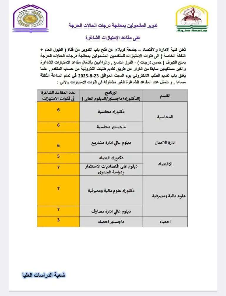 The College of Administration and Economics – University of Karbala announces the opening of the transfer process from the (General Admission + Self-Financed) channels to the Privileged Channels for students included in the decision regarding the adjustment of critical case grades by granting five additional points.